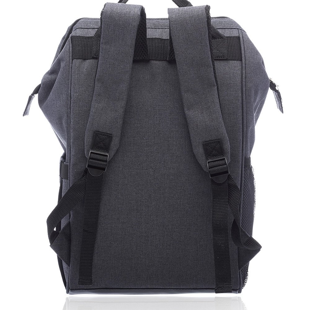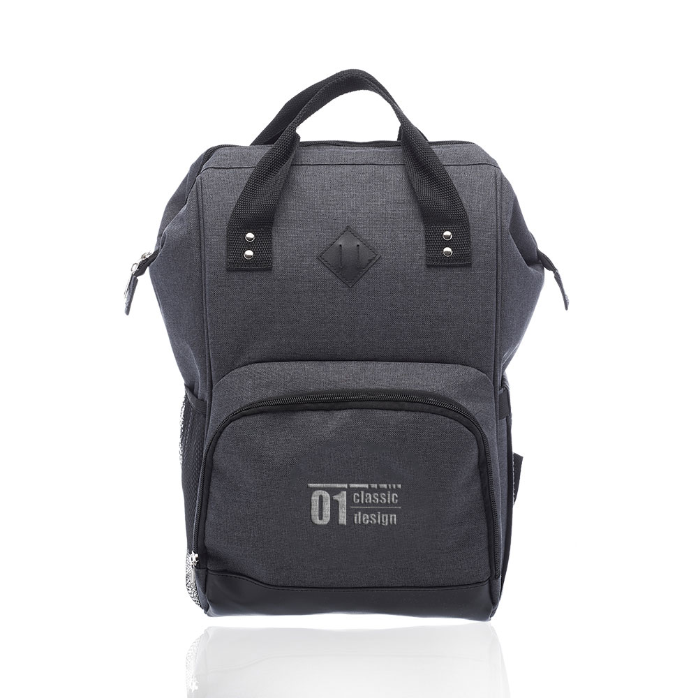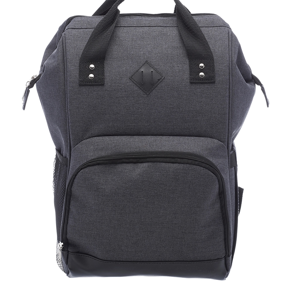 Additional InformationPolyester backpack with tote handles, insulated lining, adjustable foam shoulder straps, zipper closure and front zipper pocket.