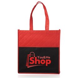 Ditch those wasteful plastic bags during your next supermarket trip and invest in this reusable option. Offered in an assortment of colors, this 13" x 13.75" x 3" two-tone, non-woven grocery bag includes a diamond quilted pattern on the front pocket and two handles made of non-woven polyester. The front pocket comes in black and the straps measure 20" in length. Add an imprinted company name, logo or message for brand exposure with every use!